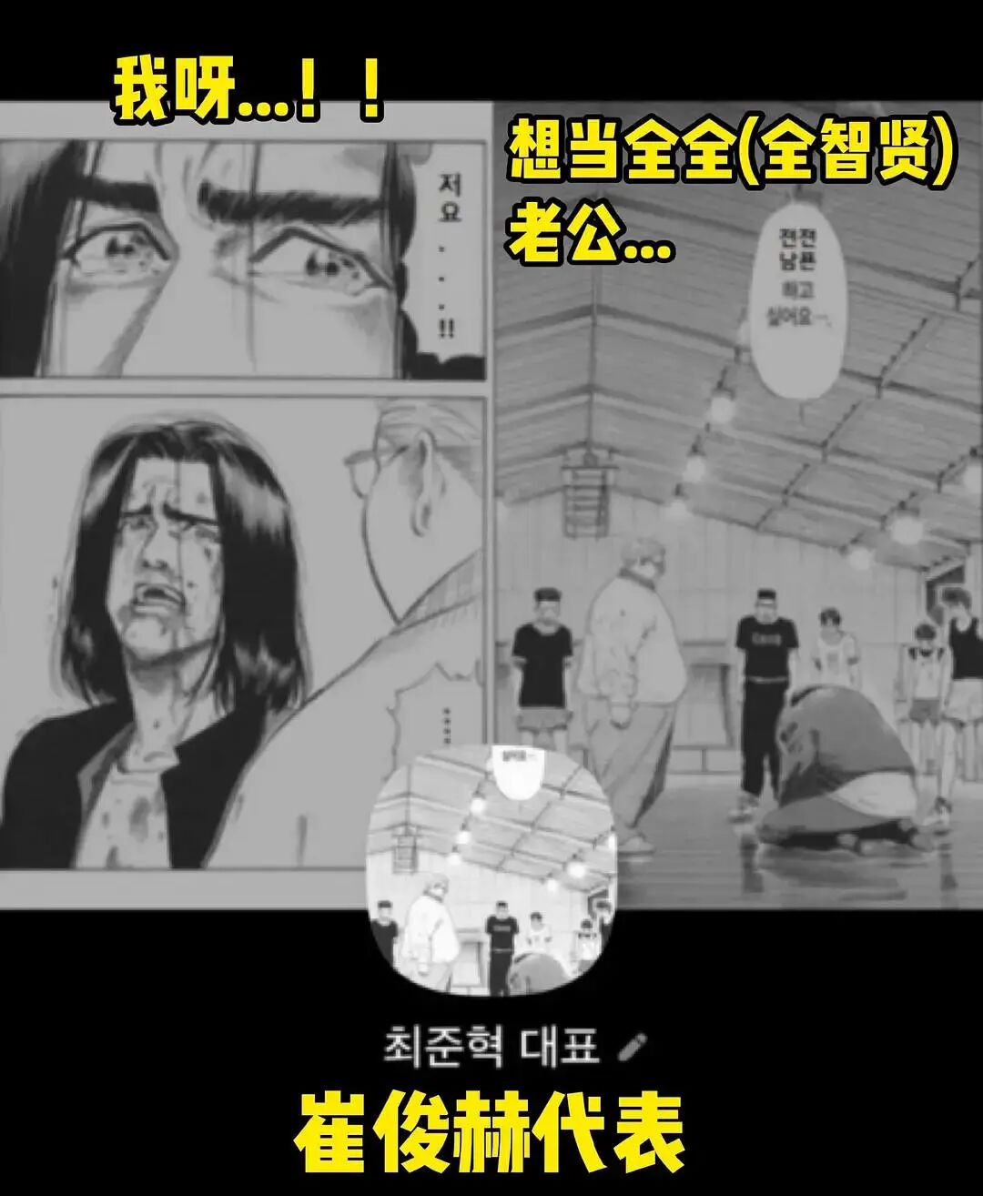 闹剧的收尾,是崔俊赫把《灌篮高手》里三井寿跪地涕泪横流的“我想打篮球”名场面P图,改成“我想当全全的老公”,还设置为社交软件聊天背景。
