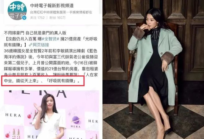 因为喜欢琢磨和投资房产,全智贤得了个外号“不动产财阀”,当包租婆收入就相当丰厚了,人在家中坐,钱从天上来。